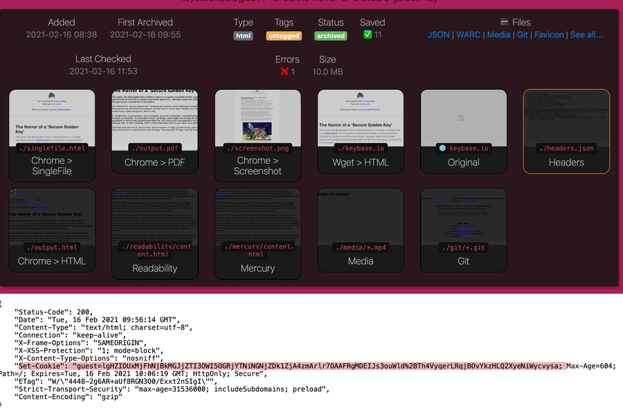 cookies.txtfile may be reflected in server responses and saved in the Snapshot output (e.g. inheaders.json) making it visible in cleartext to anyone viewing the Snapshot, (don't use your personal Chrome profile for archiving or people viewing your archive can then authenticate as you!)any secret tokens embedded in URLs (e.g. secret invite links, Google Doc URLs, etc.) will be visible on